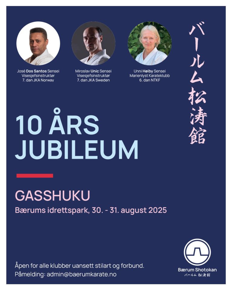 Bærum Shotokan Karateklubb fyller 10 år, og vi har gleden av å ønske dere alle velkommen til Jubileumsgasshuku. Gasshukuen avholdes i Bærum Idrettspark (BIP-hallen) på Rud lørdag 30. og søndag 31. august 2025.